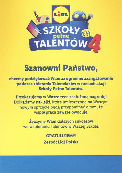 Punkty zostały wymienione na nagrody, które we właściwym czasie trafią do naszych uczniów. Dziękujemy wszystkim, którzy pomogli nam zebrać taką masę talenciaków! Widzimy się w Lidlu, mamy nadzieję, znowu za rok!