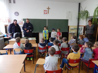 21 października 2016r. uczniowie klas 0-3 spotkali się z policjantami z Komisariatu w Cieszanowie. Goście zwrócili dzieciom uwagę na zachowanie bezpieczeństwa i ostrożności podczas drogi do i ze szkoły, przy przechodzeniu przez jezdnię. Policjanci podkreślili, jak ważną rolę pełnią elementy odblaskowe, które każdy uczeń powinien posiadać.
